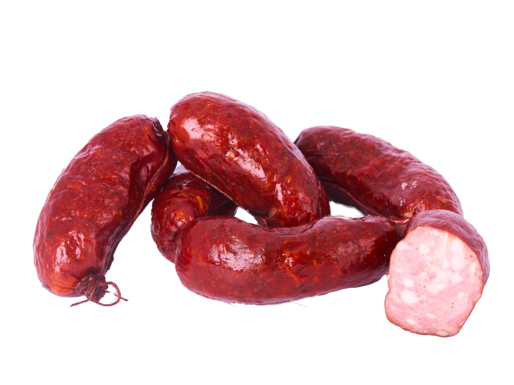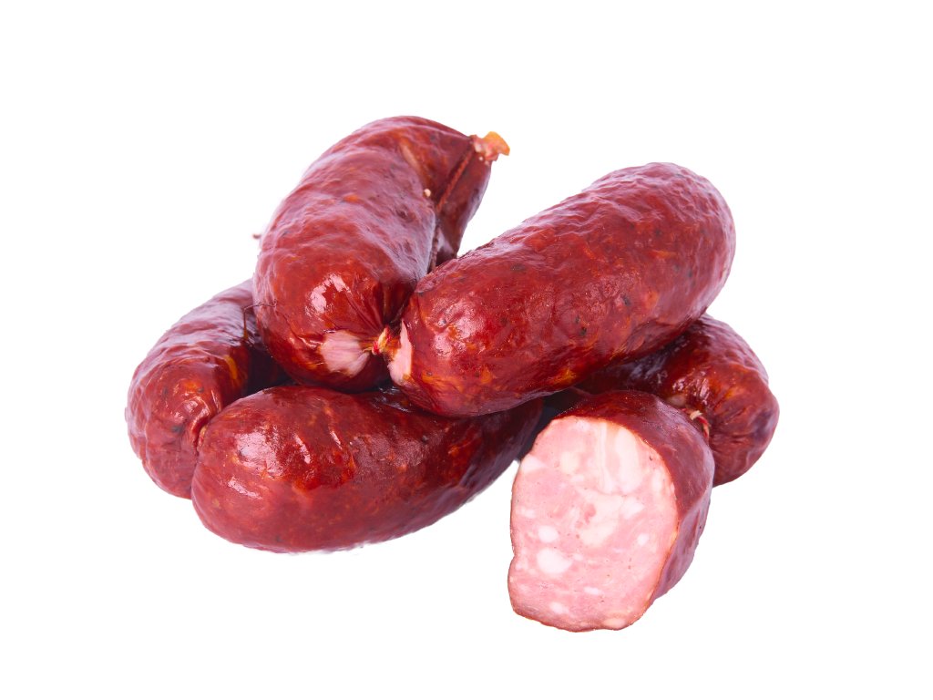 Složení: vepřové maso 47%, hovězí maso 28%, vepřové sádlo 8%, černý pepř 2%, bramborový škrob, glukozový sirup, stabilizátory: E450, 451, E452, E250, E500, antioxidant E316, dextróza, živočišná bílkovina, zahušťovadlo xanthan guma, kvasnicový extrakt, koření, vepřové střevo.
