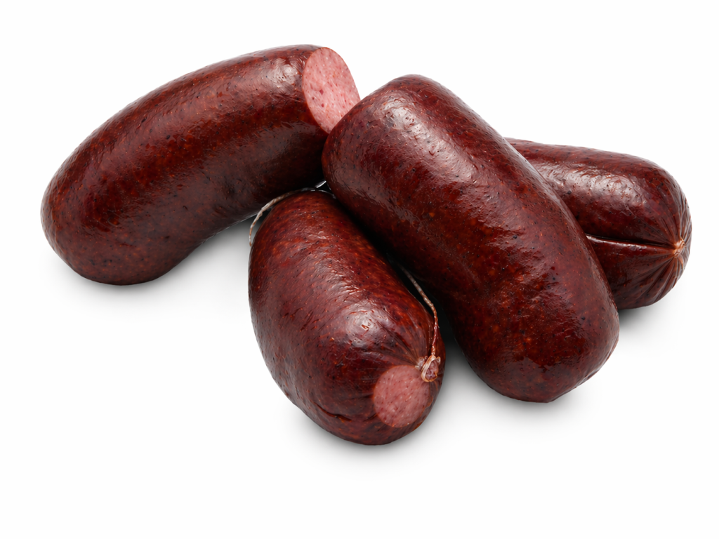 Složení: vepřové maso 34%, vepřové sádlo 28%, hovězí maso 8%, pitná voda, sůl, směs koření, stabilizátor E451, látka zvýrazňující chuť a vůni E621, antioxidant E300, E301, barvivo E160, E120, jedlé hovězí střevo.